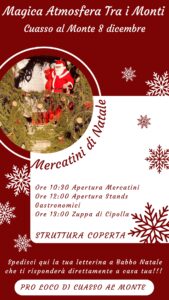 Ritorna l’evento della Pro Loco di Cuasso al Monte dedicato al Natale, quest’anno tante novità tra cui una struttura coperta che consentirà di visitare i mercatini anche in caso di maltempo, e la possibilità di pranzare al caldo all’interno del Nuovo Teatro di Cuasso.