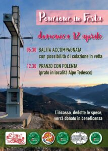 Anche quest’anno la Pro Loco di Cuasso al Monte, Pro Loco Valganna e gruppo Alpini di Cuasso e Valganna, organizzeranno PONCIONE IN FESTA, evento a scopo benefico per onorare la nostra montagna e per passare un giorno di festa tutti assieme. Alle ore 5:30 ritrovo al parcheggio dell’Alpe Tedesco , partenza con possibilità di colazione in vetta. A ora di pranzo gli stand gastronomici delle associazioni serviranno polenta con salamella alla griglia, panini, polenta e Zola. VI ASPETTIAMO NUMEROSI.